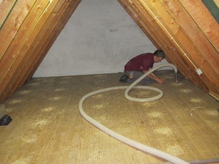Als de zoldervloer van hout is boren wij eerst gaten volgens een vooraf bepaald patroon in de zoldervloer. Daarna blazen wij, met een inblaas pistool, het isolatie materiaal in deze gaten. Het isolatie materiaal verspreidt zicht onder het gehele vloer oppervlak. Het isolatie materiaal dat wij hiervoor gebruiken is Knauf Supafil HR++ glaswol.